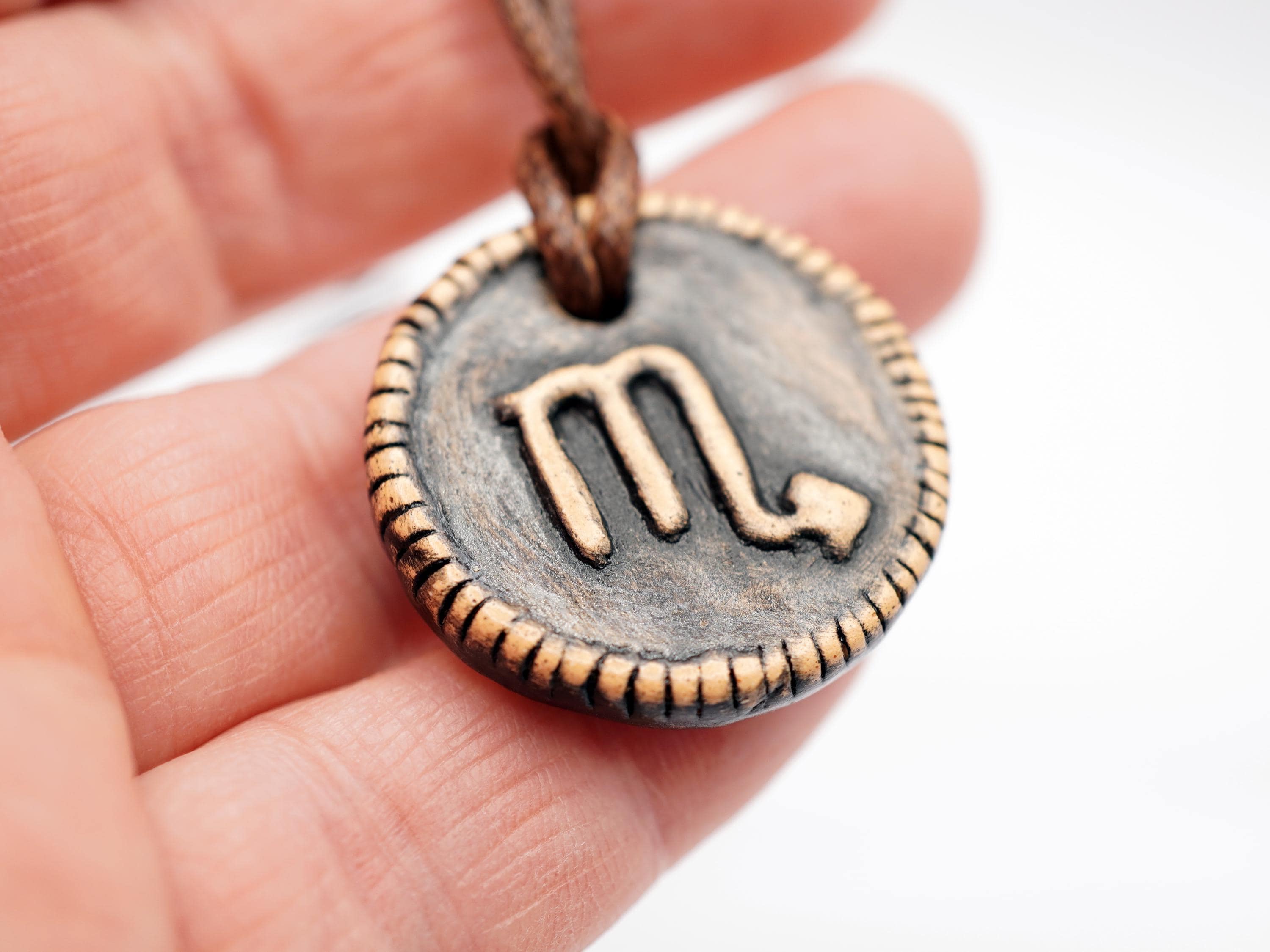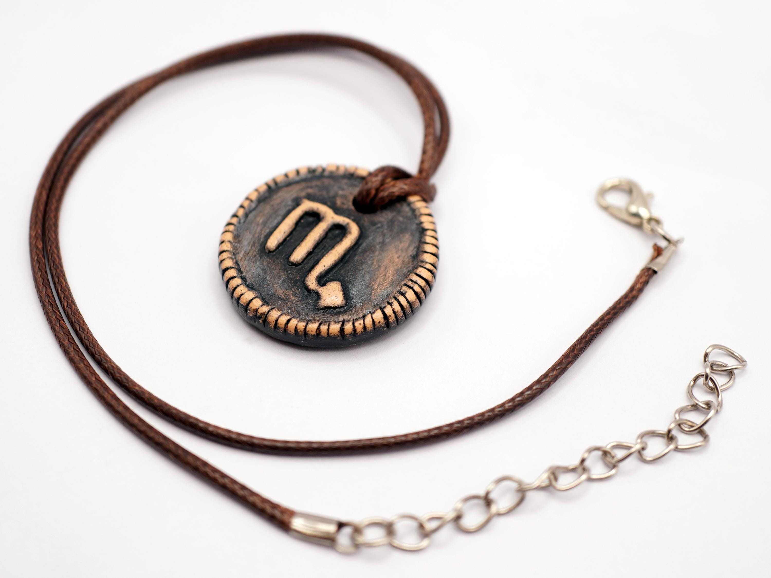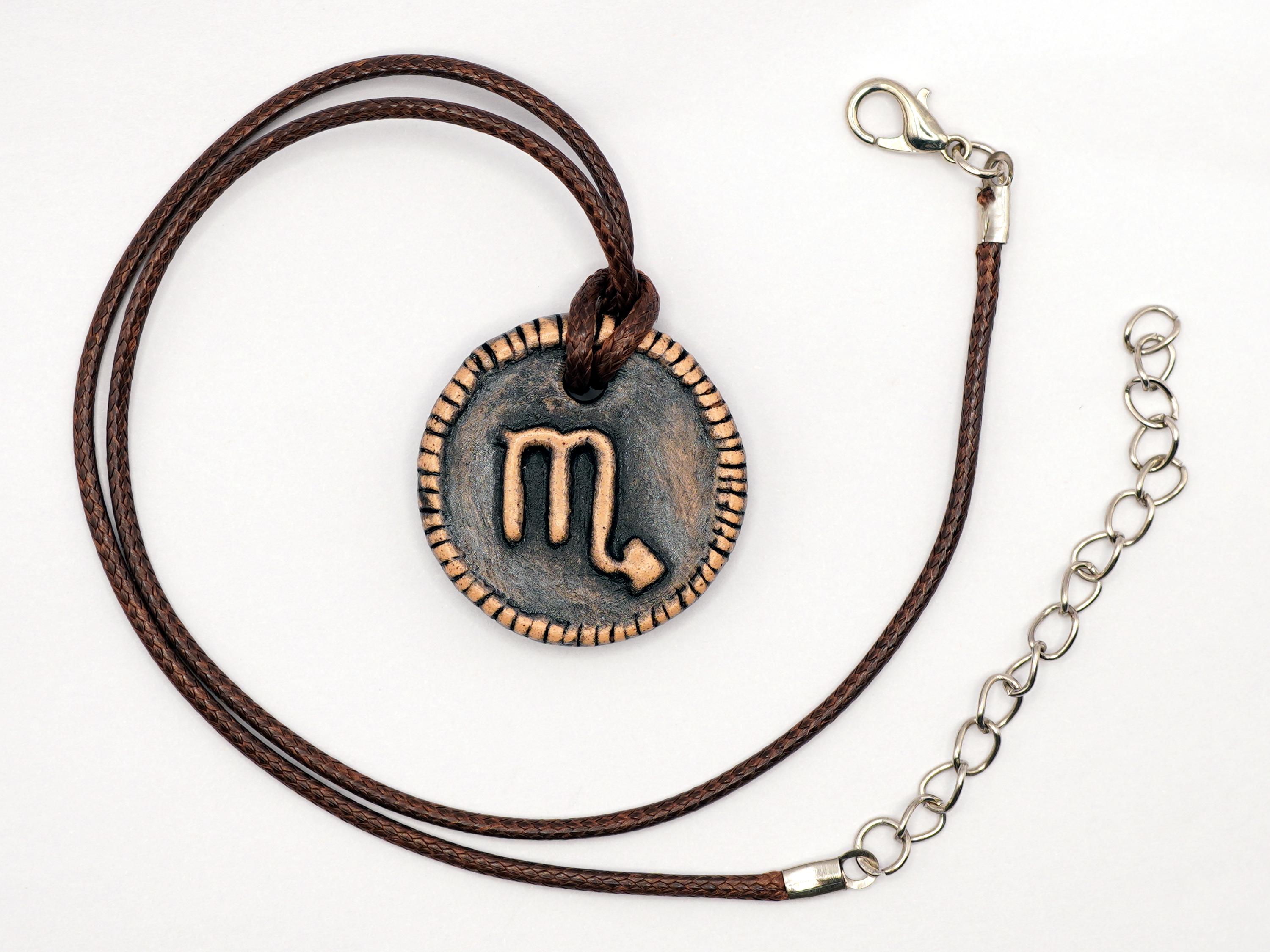 This round ceramic pendant is hand-sculpted from clay, kiln-fired, hand-painted in dark charcoal and warm beige tones, then sealed with protective lacquer. The raised Scorpio symbol gives the piece a bold but natural look — perfect for everyday wear or as a thoughtful zodiac gift.