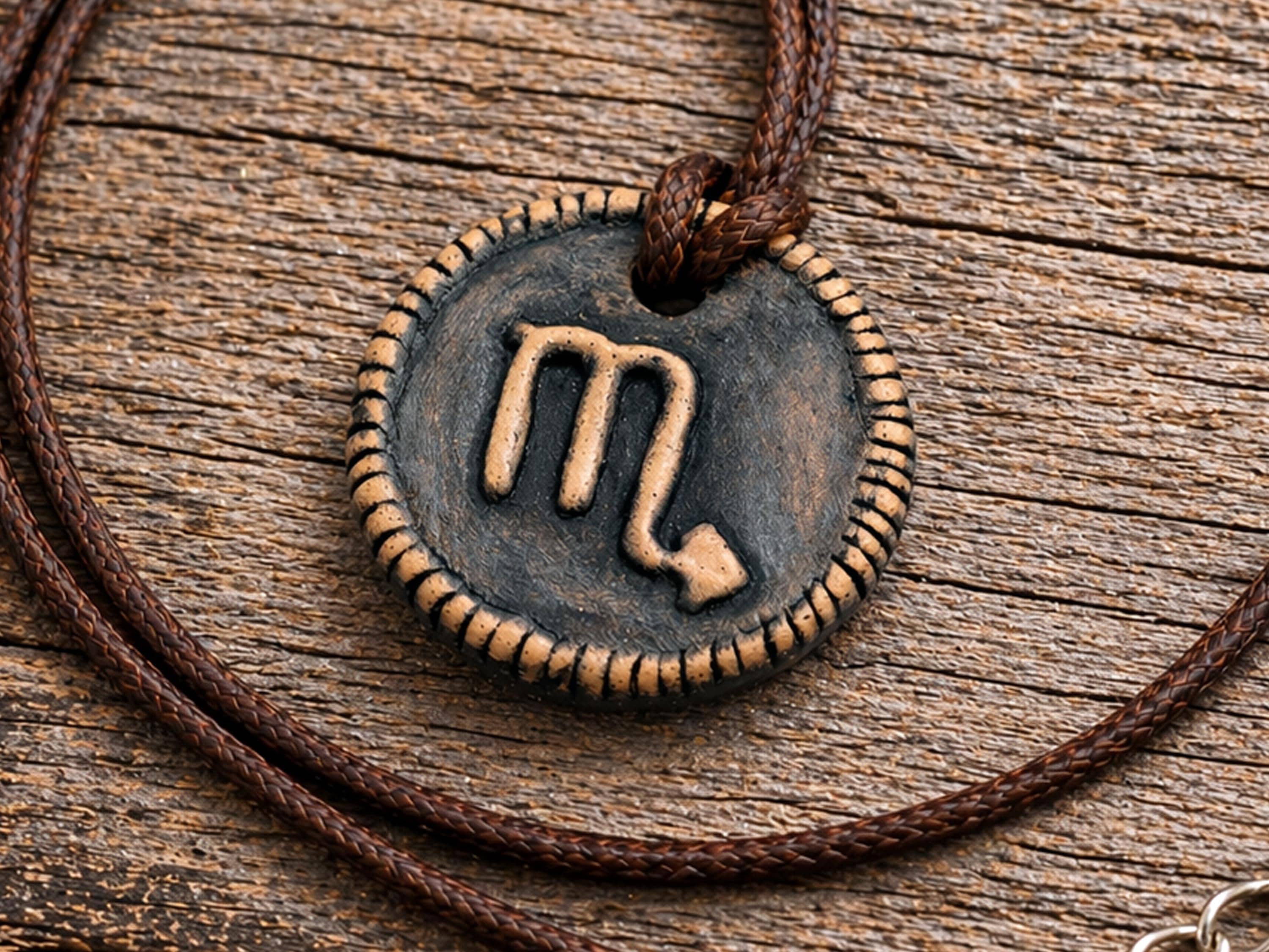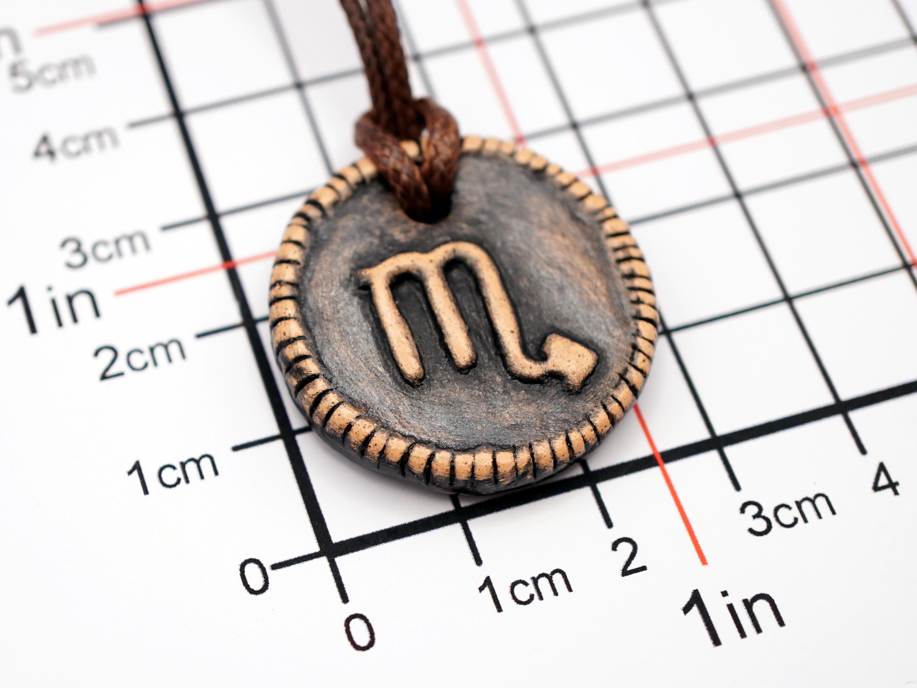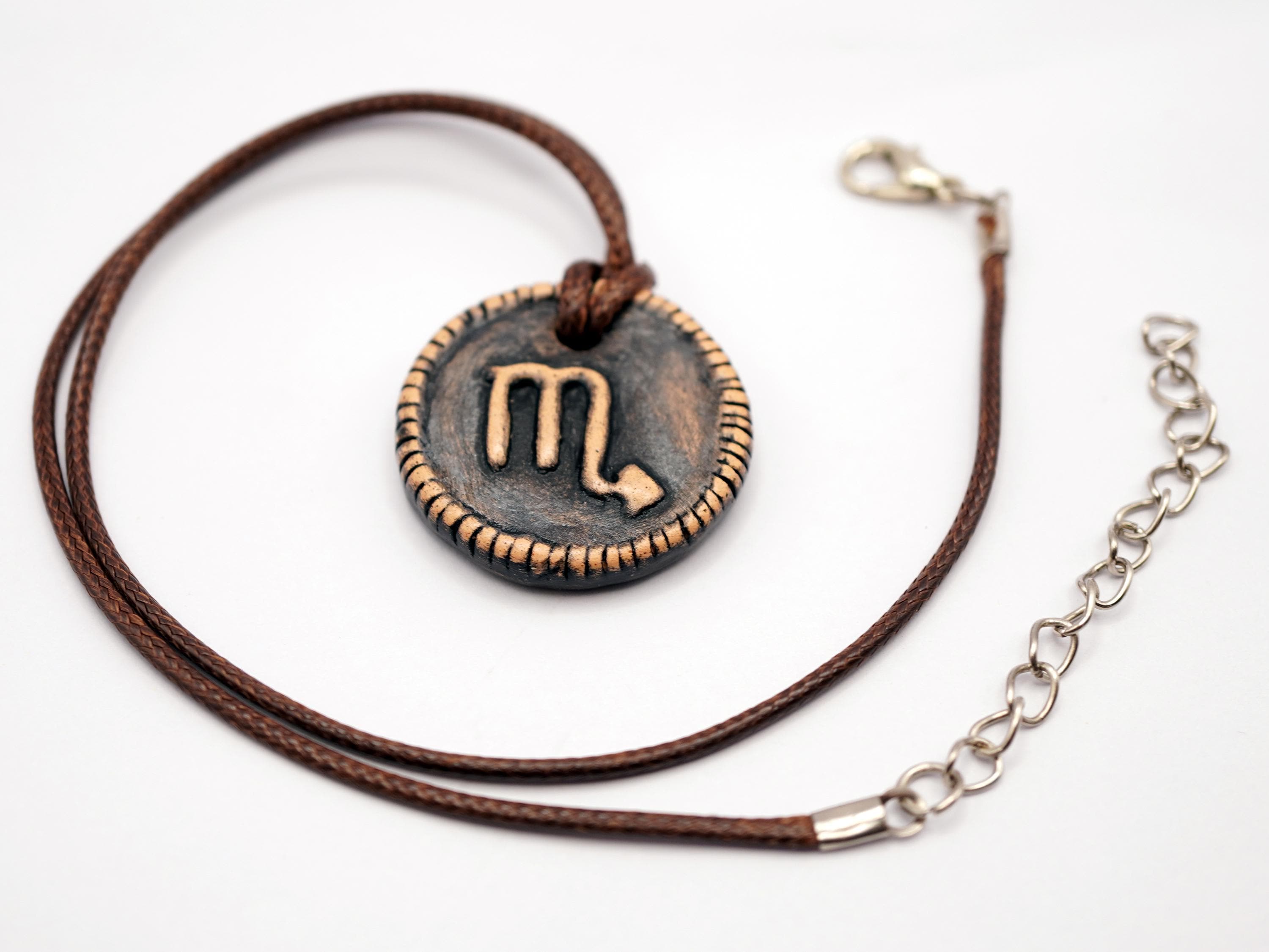 This round ceramic pendant is hand-sculpted from clay, kiln-fired, hand-painted in dark charcoal and warm beige tones, then sealed with protective lacquer. The raised Scorpio symbol gives the piece a bold but natural look — perfect for everyday wear or as a thoughtful zodiac gift.
