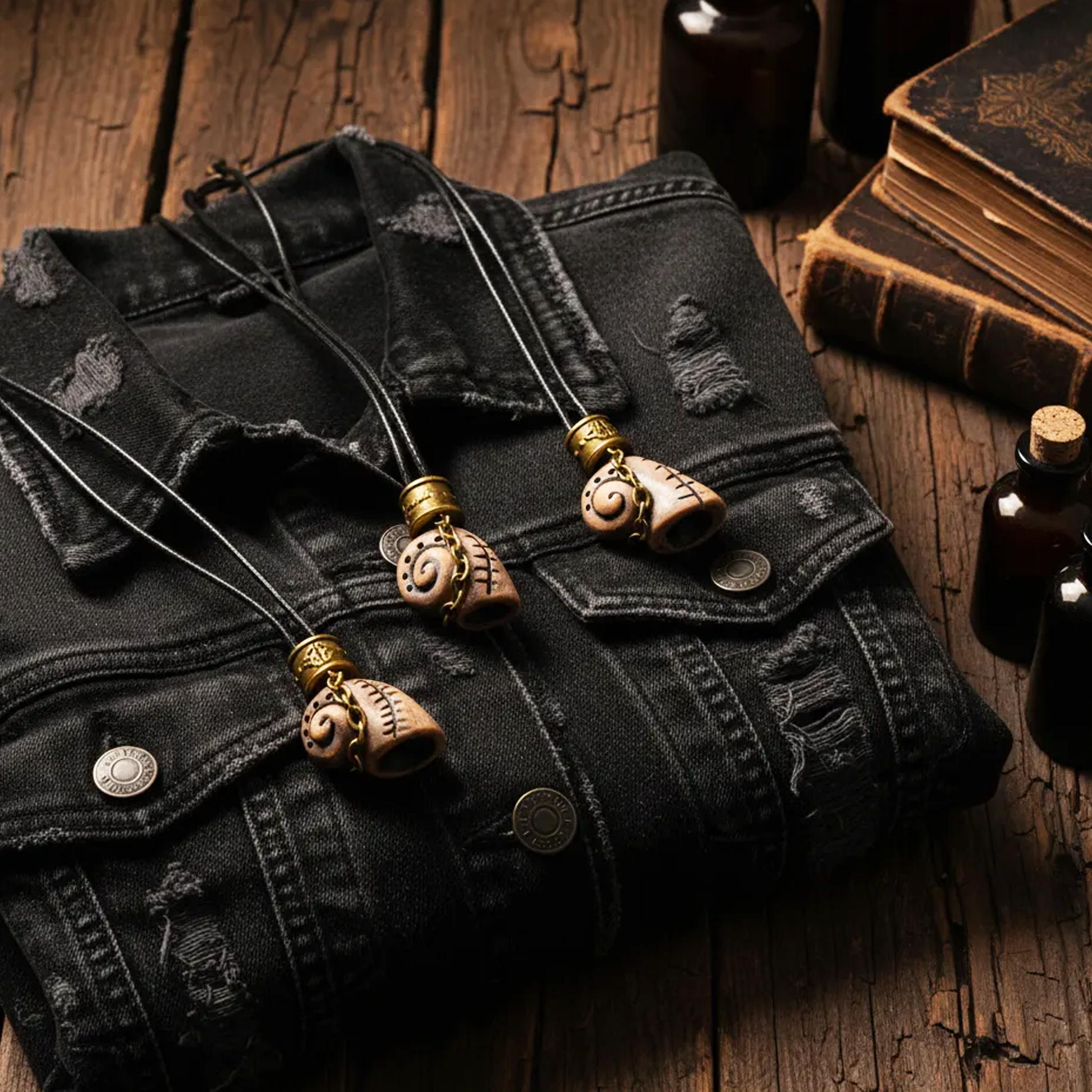 The surface is carefully finished in warm, earthy tones and decorated with hand-drawn details that highlight the spiral form. A subtle antique-style chain wraps around the shell, adding a touch of raw, mystical character. The pendant is suspended on a black cord and finished with a decorative metal bead featuring Celtic-inspired detailing.