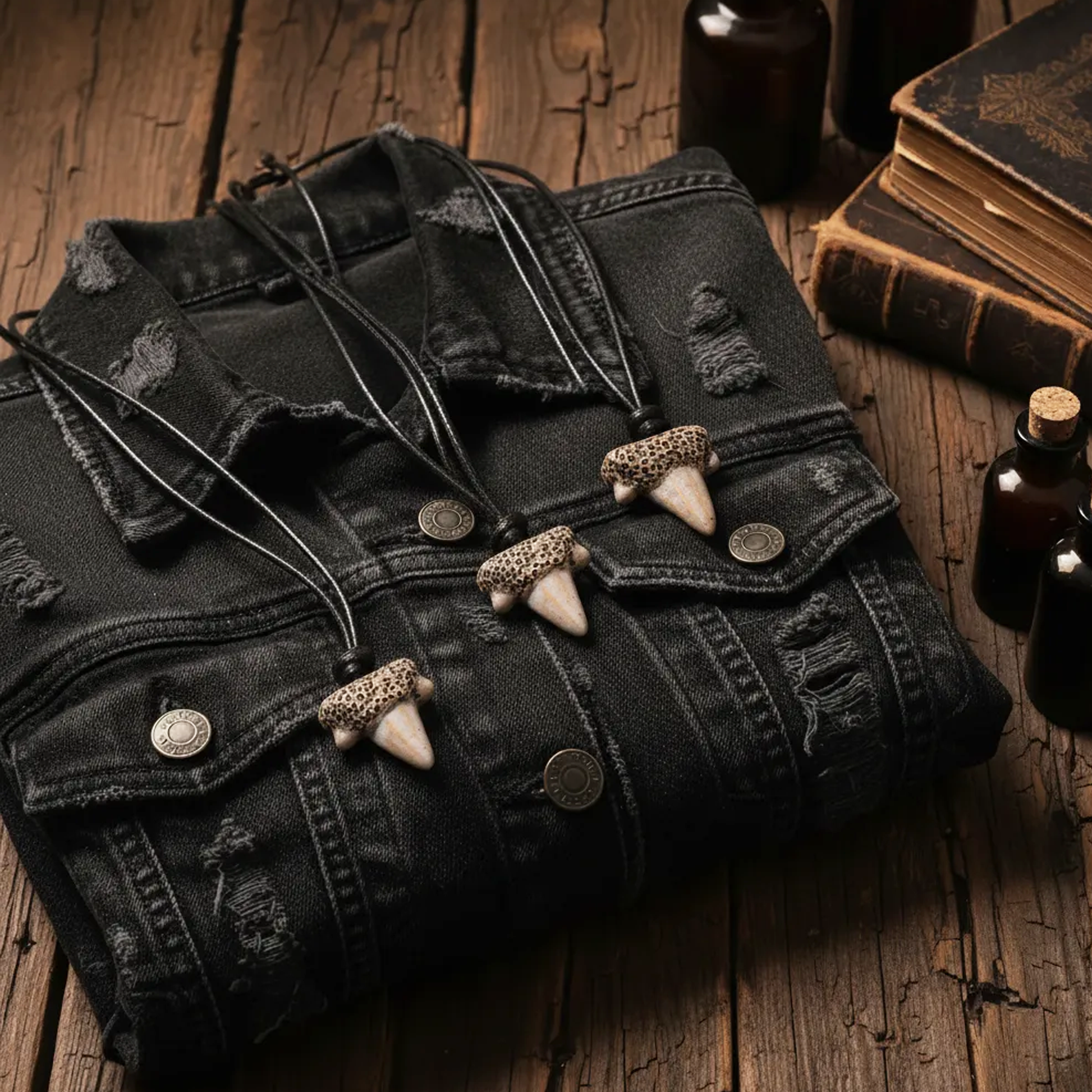 A hand-sculpted ceramic shark tooth pendant with a fossil-like texture. Fired, painted, and sealed by hand. A perfect piece for lovers of ocean relics, dark natural history, and alternative fashion.