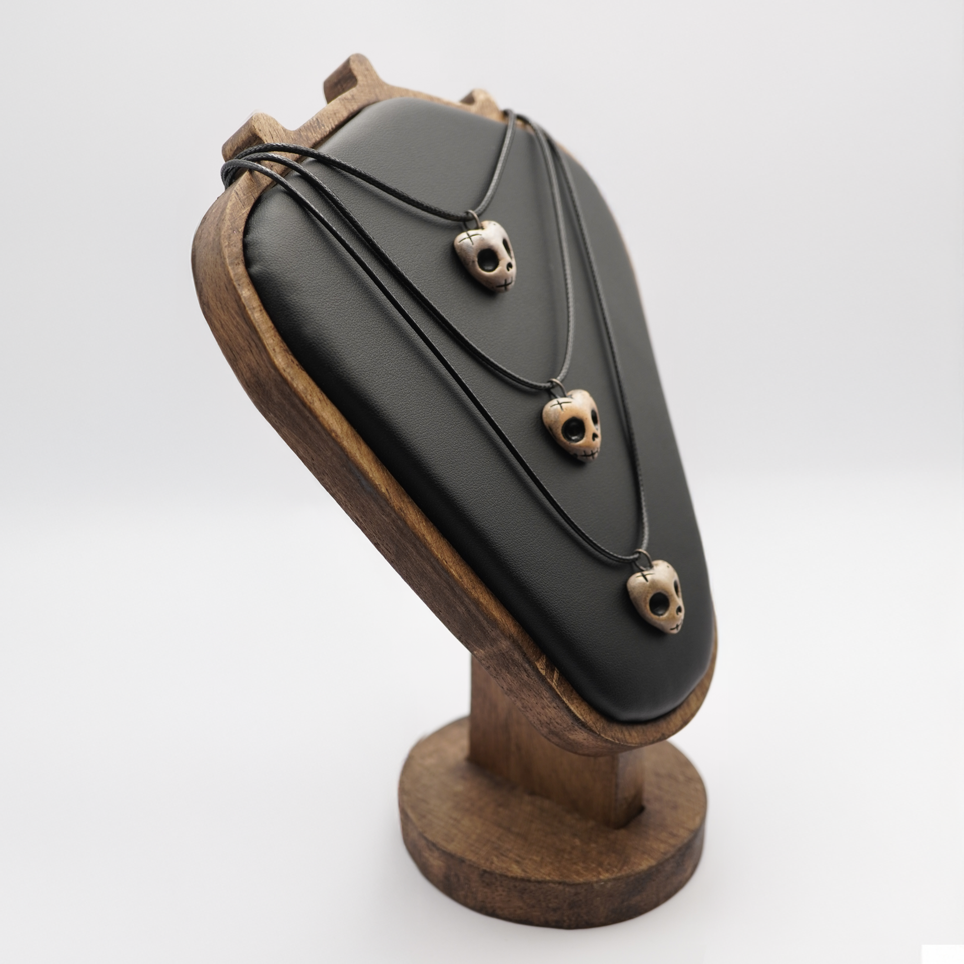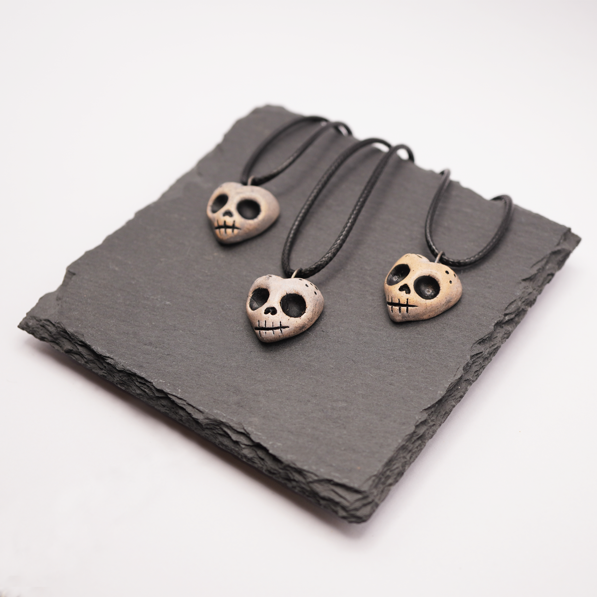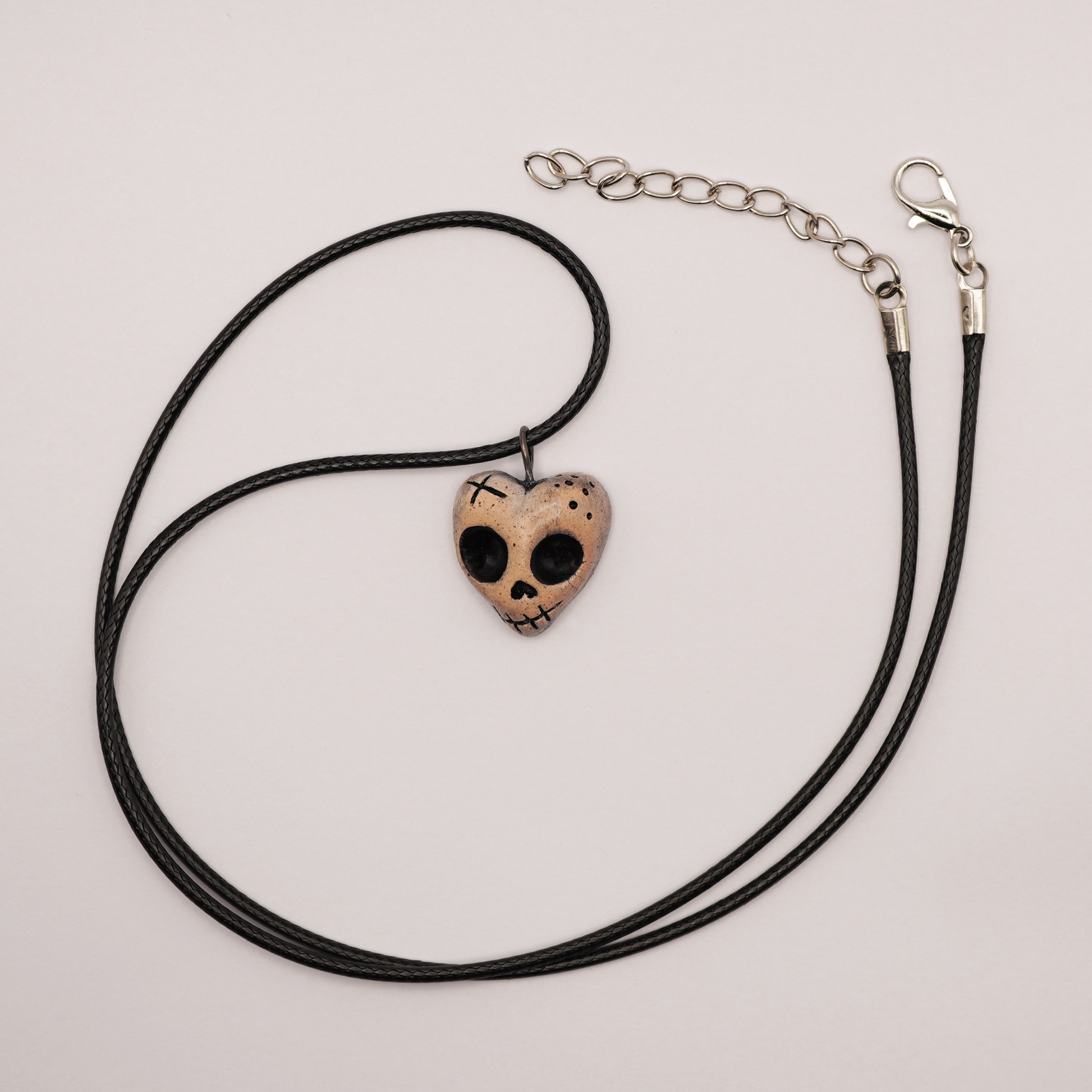 A tiny, spooky heart-shaped skull pendant – perfect for lovers of gothic, dark, or alternative style. Each piece is completely handmade from ceramic, fired, hand-painted, and sealed with clear lacquer for an aged, antique look. No two pendants are exactly the same.