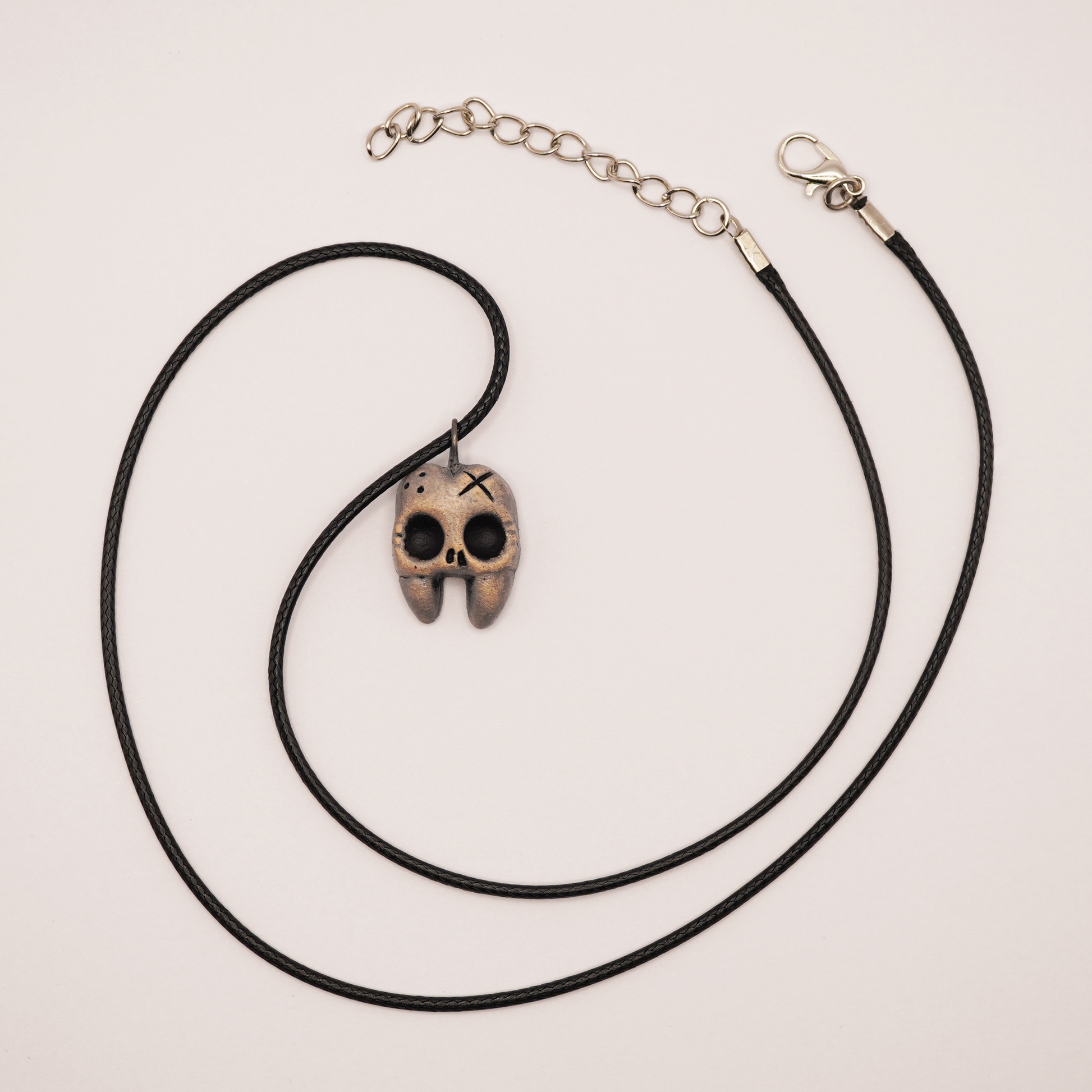 A tiny, spooky tooth-shaped skull pendant – perfect for lovers of gothic, dark, or alternative style. Each piece is completely handmade from ceramic, fired, hand-painted, and sealed with clear lacquer for an aged, antique look. No two pendants are exactly the same.
