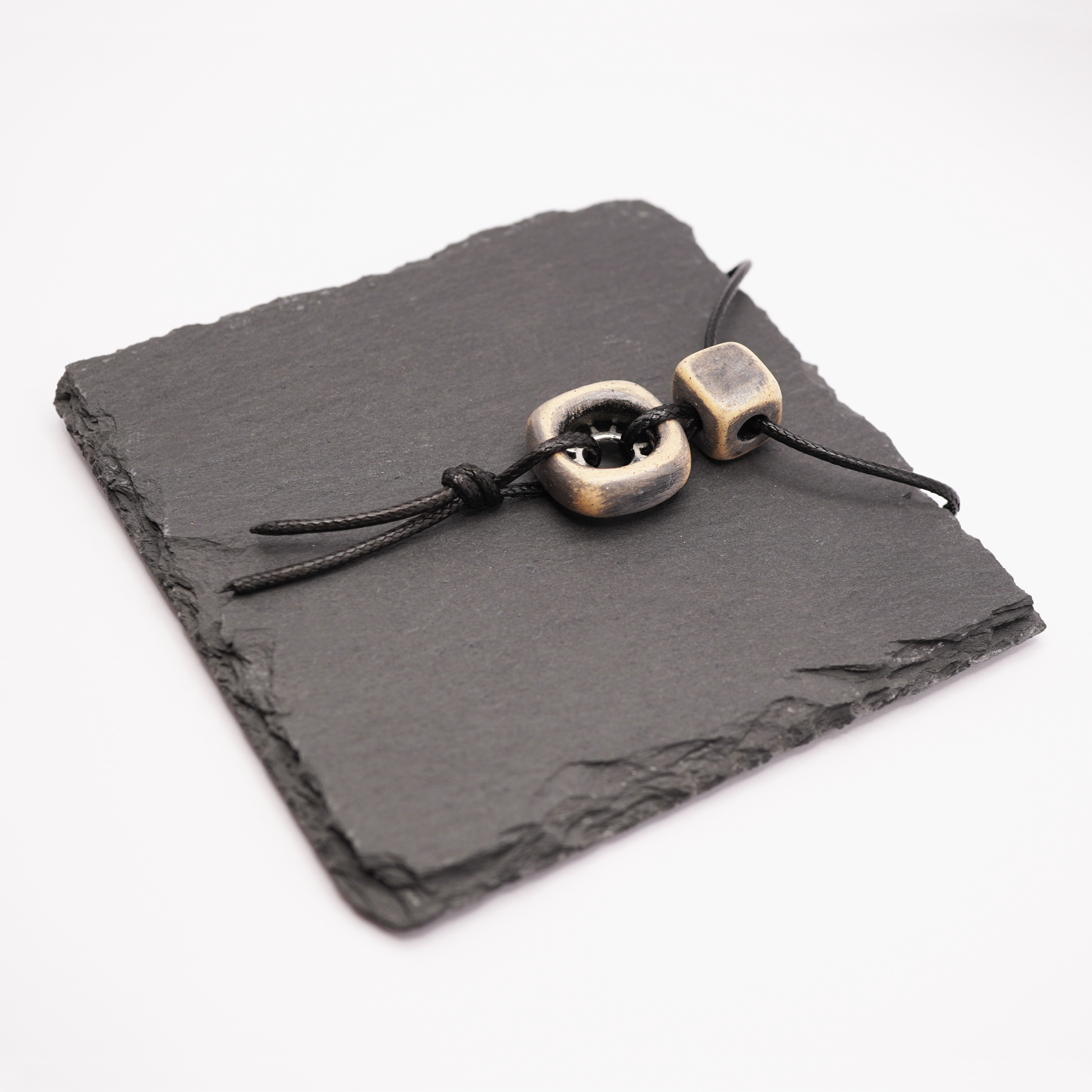 - Cord: black faux leather, adjustable length (50–55 cm)